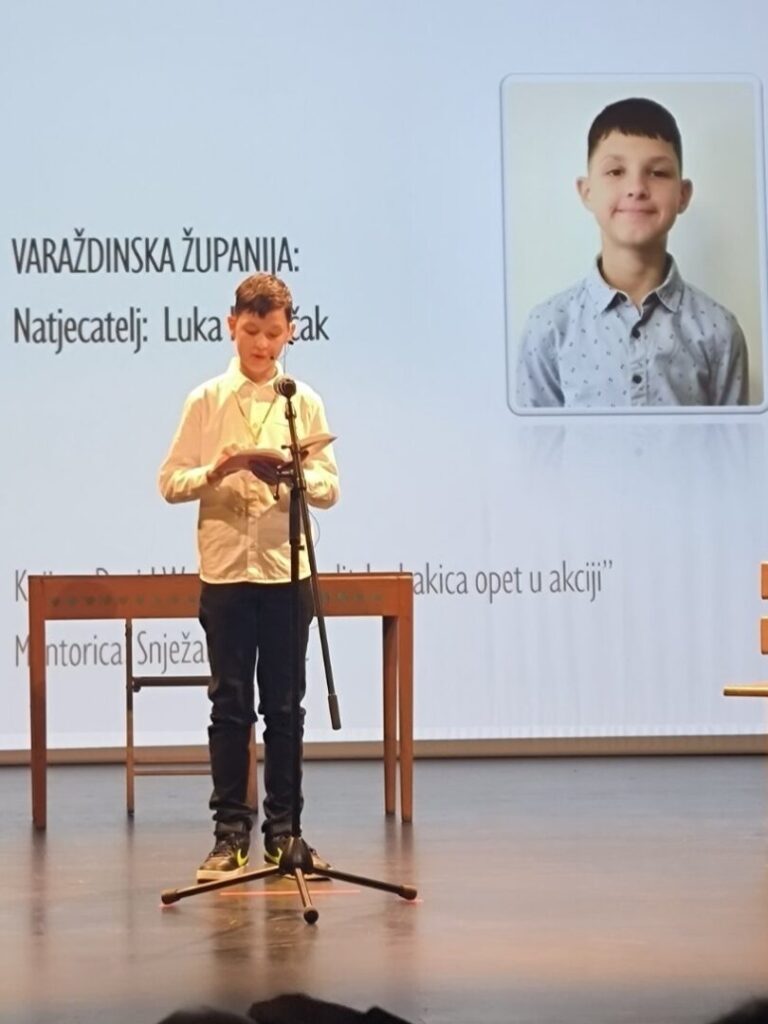 Varaždinsku županiju u mlađoj kategoriji predstavio je učenik Luka Kotiščak, uz mentoricu Snježanu Hranić. Luka je svojim sigurnim nastupom, izražajnim čitanjem i velikim entuzijazmom osvojio izvrsno 2. mjesto.